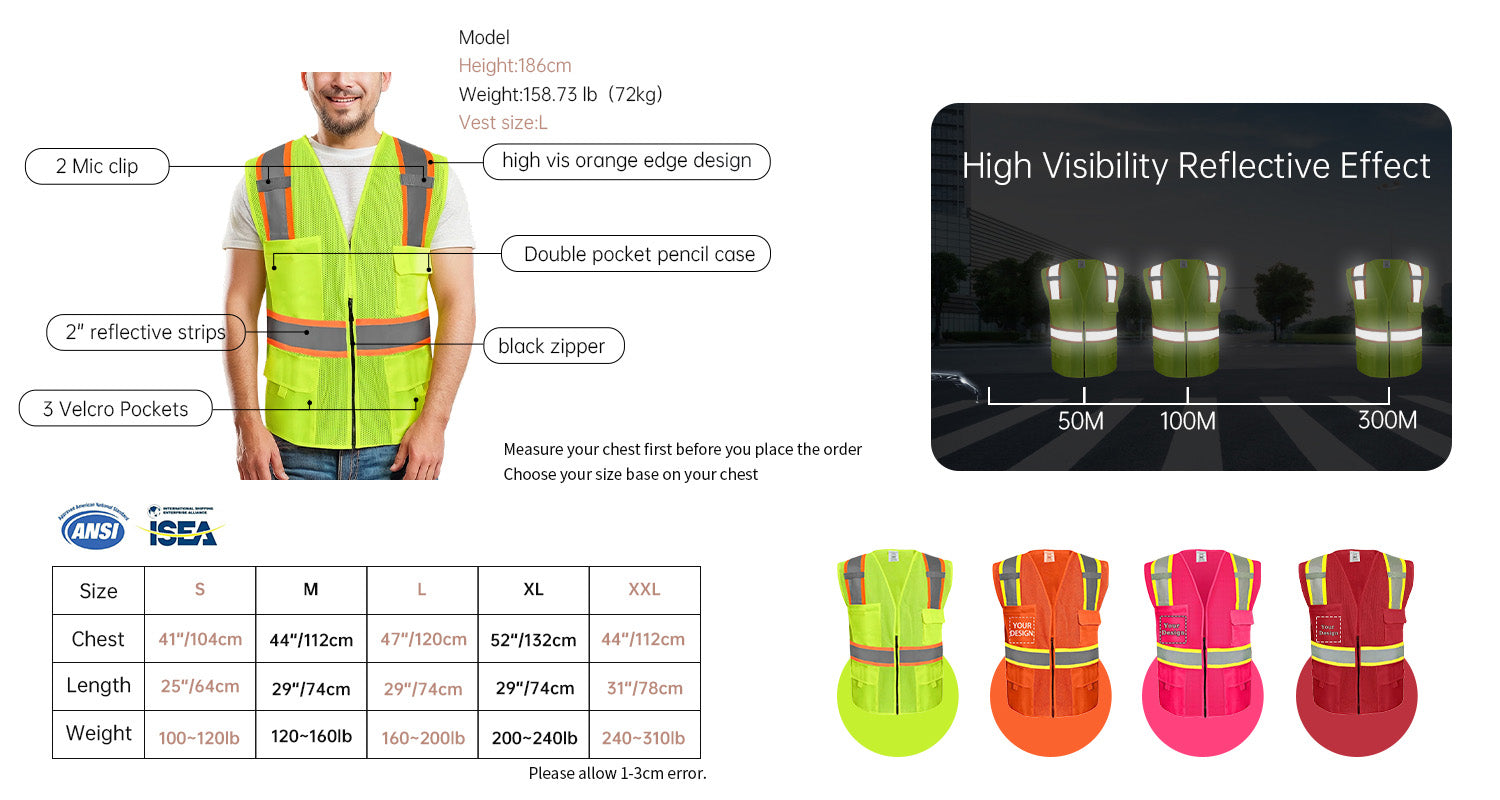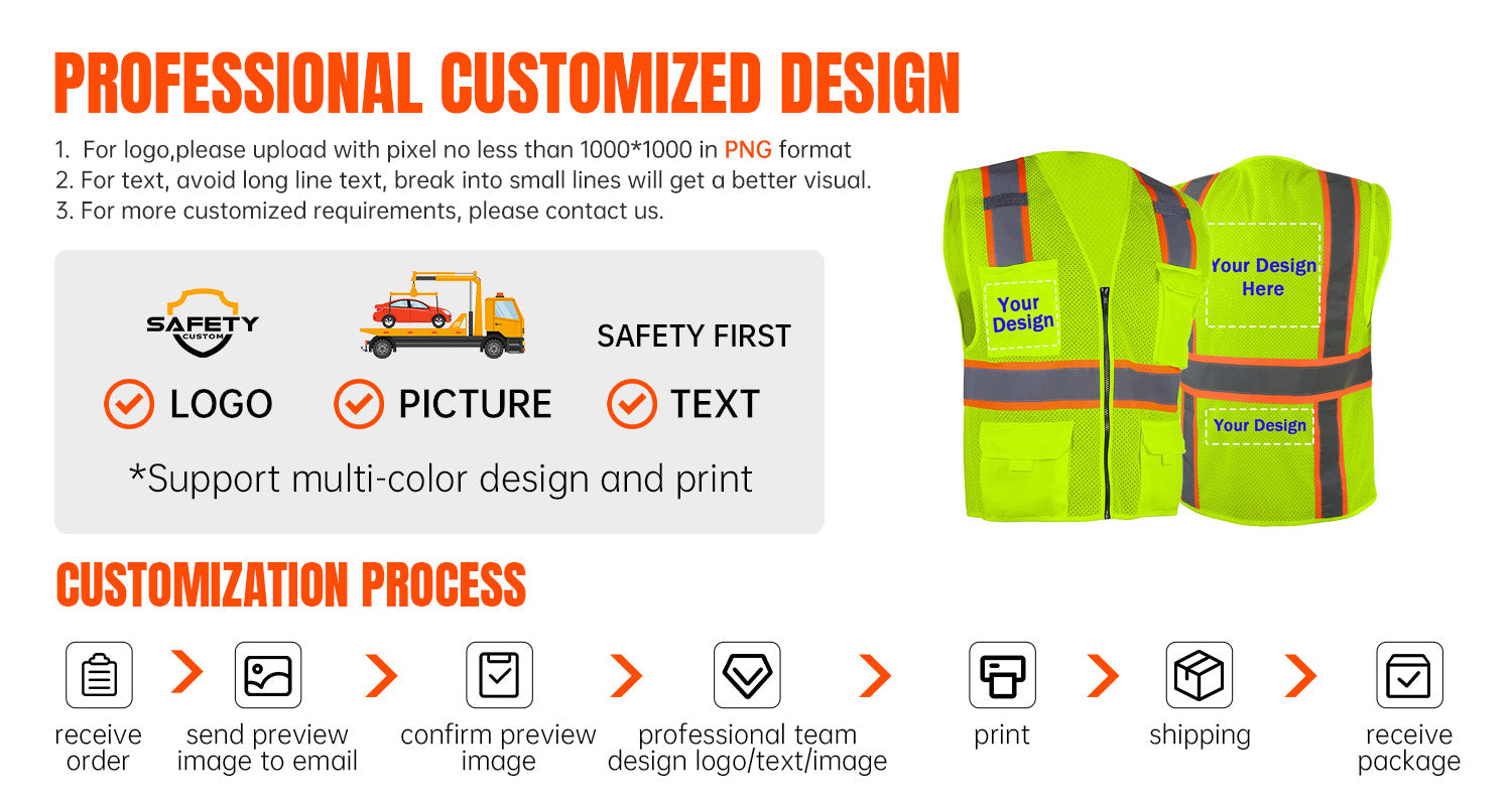 Custom Logo Safety Vest, Reflective Safety Vest, Class 2 ANSI with 5 Pockets Zipper High Visibility Construction Uniform